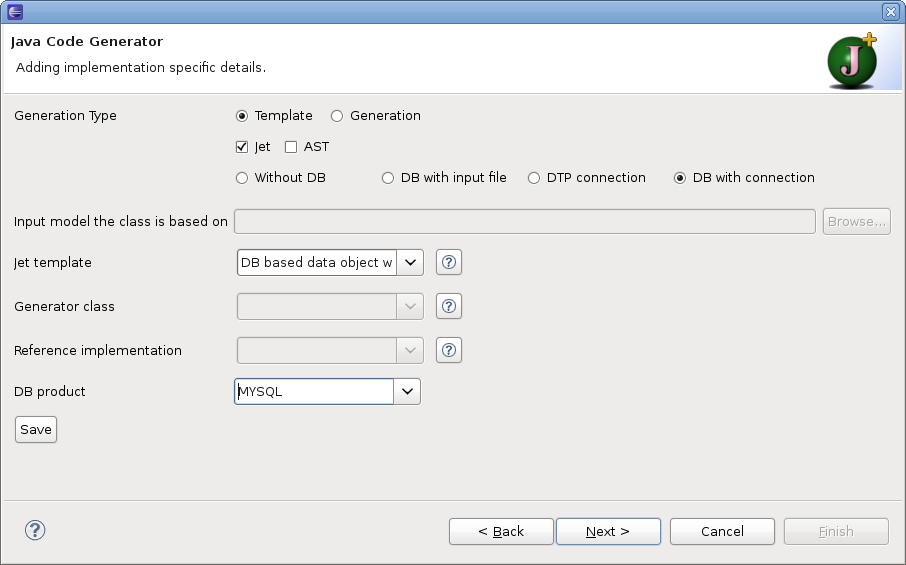 On the second page in the first section you specify the way to generate the code. For the generation with a Java Emitter template you can leaf everything as is. Template states that the generation is template based (vs. generated from scratch). Jet in the second row says that the template is a JETemplate. The third row tells something about the input model. With "DB with input file" you specify the input model through an input file.